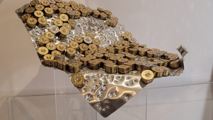 SWELL Smalls Gallery 2023 Artwork – Cause and Effect ‘Cause and Effect’, an aluminium panel using the artist’s distinctive art making technique – that’s right, Rae shoots her work! Cause is expressed by the brass casings from recycled empty 12-gauge shotgun shells that adorn the aluminium, covering large parts of the panel contrasted by Effect, the