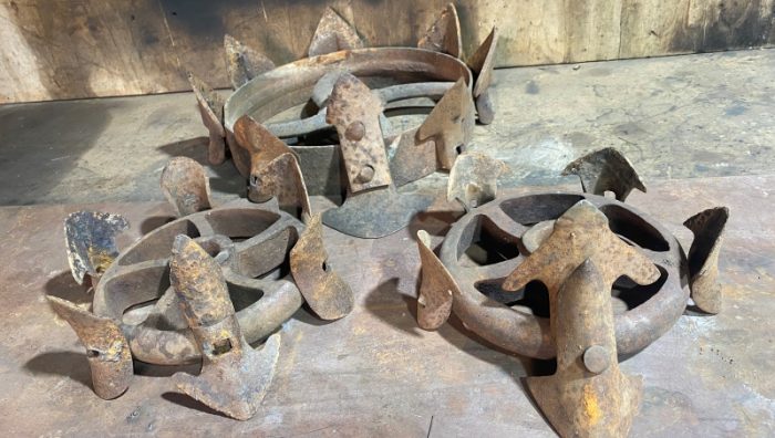 SWELL Smalls Gallery 2023 Artwork – Sovereign ‘Sovereign’ is a series of works based on the form of a crown, fashioned from obsolete farming equipment. Each is presented on a ‘cushion’ made of rammed earth, referencing the European tradition of presenting the Crown Jewels on a velvet cushion. However, there is a stark contrast between the