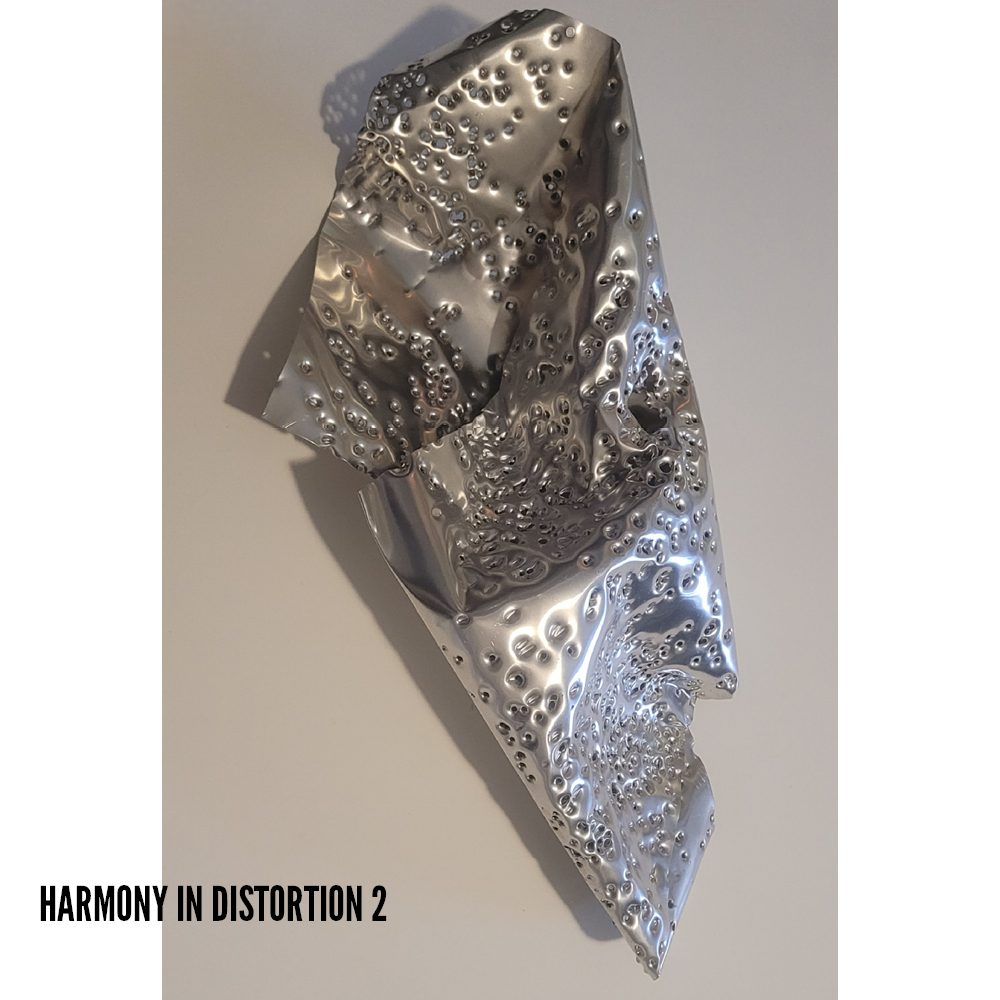 Rae Saheli delves into the intricate realm of twisted, perforated aluminium created by the artist distinctive technique. Harmony in Distortion is a tale of tension and release, of structured chaos, and an exploration of the sculptural potential in the malleability of aluminium.